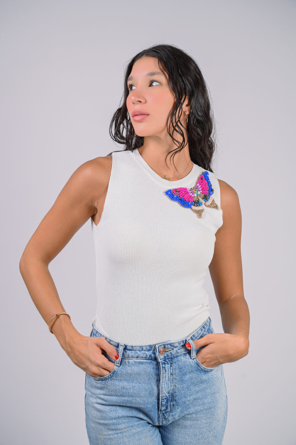 What sets this cotton knit tank top apart is its unique ‘painted lady’ design. The intricate artwork adds a touch of elegance and uniqueness to an otherwise simple garment, making it a standout piece in your collection.