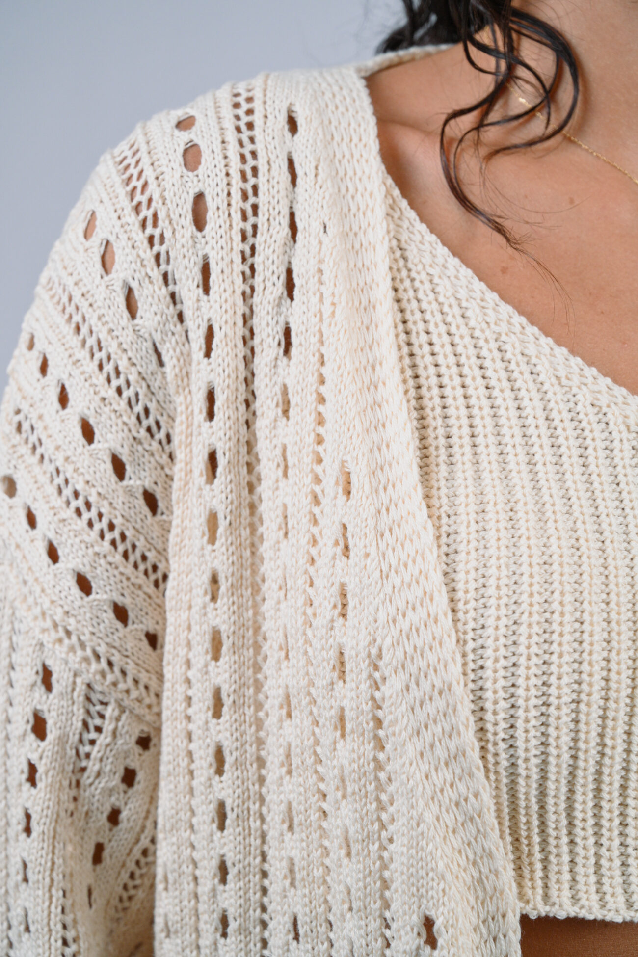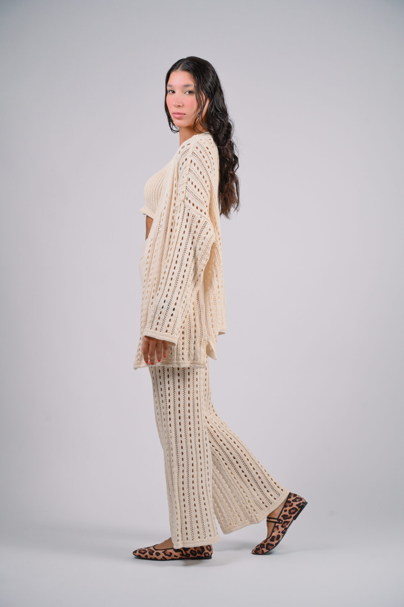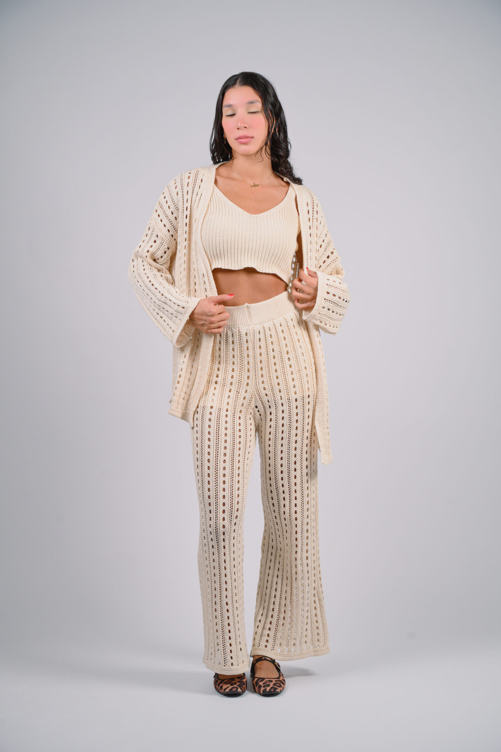 The design of the Sunkissed in Santorini knit set is both sophisticated and versatile. The three pieces can be mixed and matched with other items in your wardrobe, offering a wide range of styling options.