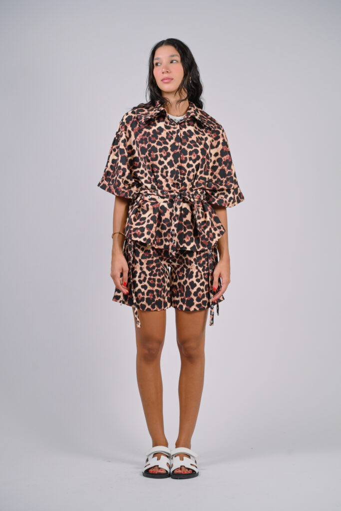 Our printed crepe with heart buttons adorned with small pearls offers a charming and delicate style. This luxurious fabric is crafted from 100% crepe, ensuring both comfort and elegance.